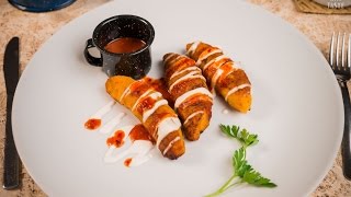 Cerrar con cuidado para que no salga el relleno y dar forma de croqueta o de bigote. Se pueden pasar por harina o pan molido opcionalmente.
