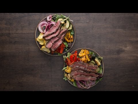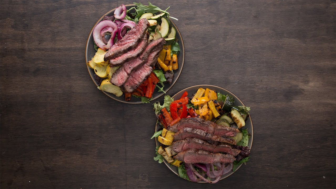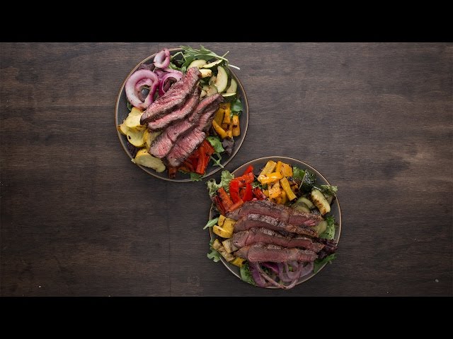 8. Arrange vegetables and steak on a bed of mixed greens.