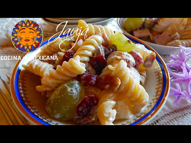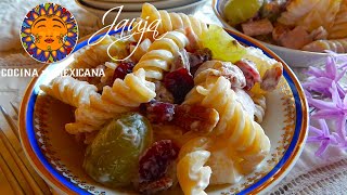 Pasta Fría Navideña. Pasta Fría Navideña de Jauja Cocina Mexicana. Pasta de tornillo cocinada a la perfección en crema de yogurt con arándanos, uva verde y nuez tostada. Receta completa paso-a-paso, ingredientes y secretos de cómo hacer Pasta Fría. Una tradición de Jauja Cocina Mexicana para consentir a la familia cualquier día, y para celebrar en las cenas de Navidad y Año Nuevo. Buen provecho.