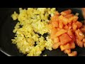 Picamos cebolla y ajo de forma muy fina. Ponemos un poco de aceite en una sartén a fuego medio y cuando esté caliente añadimos la cebolla y el ajo hasta que el ajo esté algo dorado y la cebolla transparente o pochada. Apagamos la sartén y retiramos del fuego.