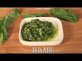 2. Pelamos el ajo y añadimos al mortero la albahaca y el diente el ajo. Y una pizca de sal.