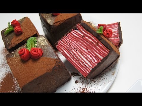 Capas y capas de crepes de chocolate decadentes, vestidos con crema de nata y mascarpone! Este delicioso pastel de Red velvert es el sueño de un amante del chocolate! Cubra cada rebanada con la deliciosa salsa , para hacer este pastel aún más dulce lo bañamos con un buen CHOCOLATE!