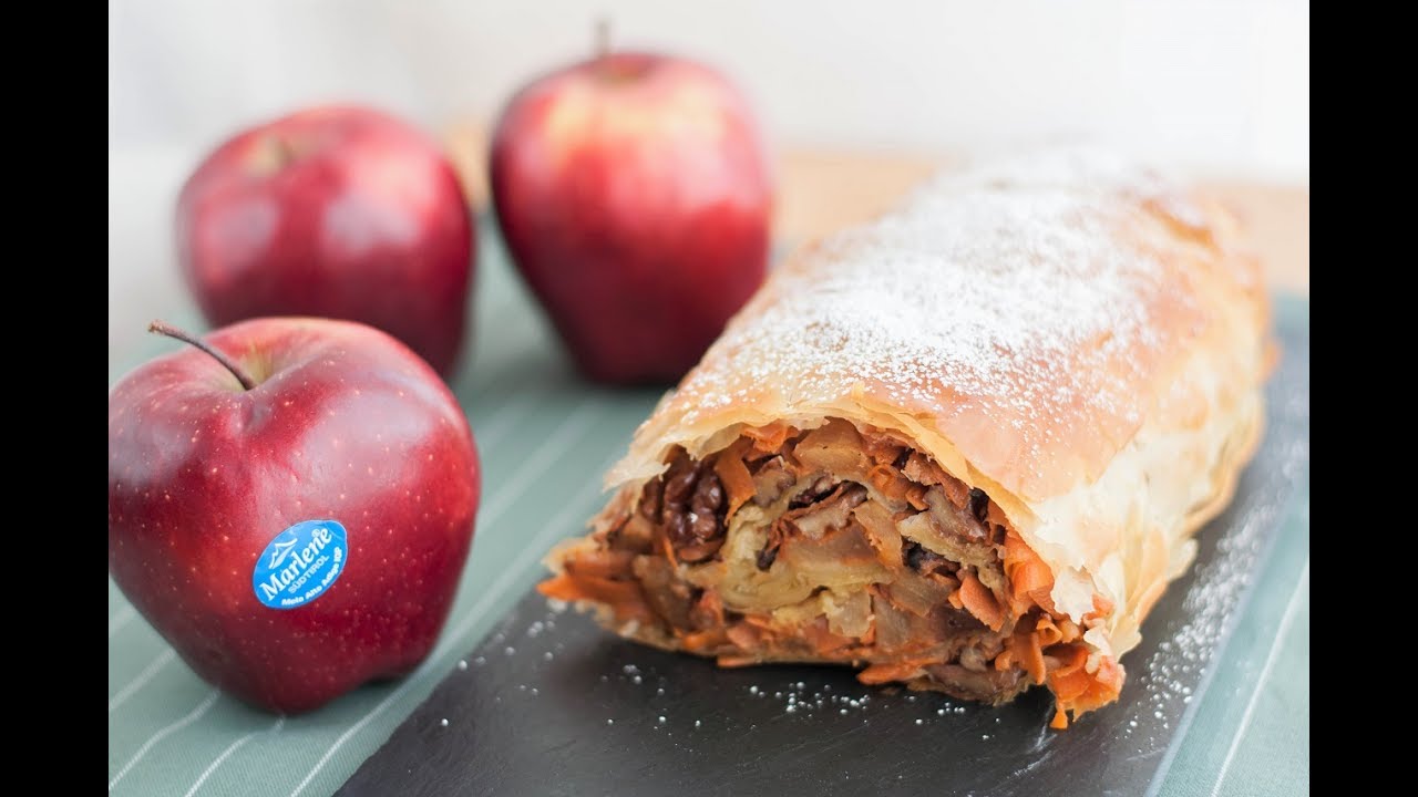 Cómo hacer un strudel de manzanas muy original. Receta crujiente por fuera y jugosa por dentro. Strudel relleno de manzana y zanahoria, delicioso.