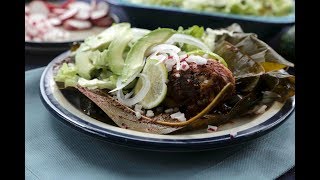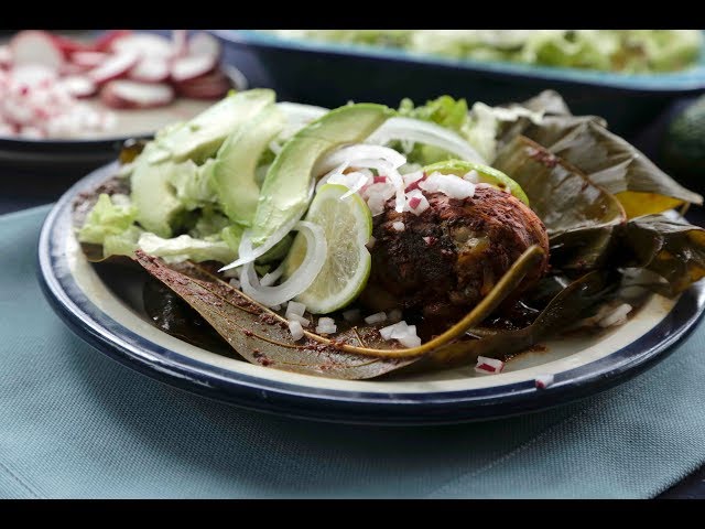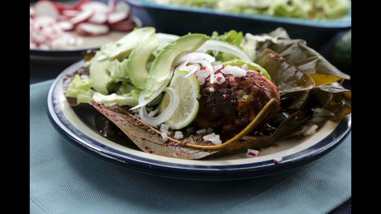 Esta es la versión poblana de barbacoa de pollo, un plato tradicional de la cocina mexicana que se prepara en hojas de plátano y de aguacate, se sirve como plato fuerte.