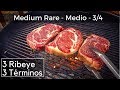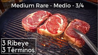 Guía personal y sencilla para asar los cortes de carne al punto o término deseado. Decidí utilizar ribeye porque es un clásico de la parrilla y lo escogí de un grosor considerable (poco menos de 1 pulgada) pero sin llegar a ser demasiado ancho. Sazonado únicamente con sal de mar y asado por 4, 7 y 9 minutos por lado para obtener el término médium rare, medio y 3/4 respectivamente.