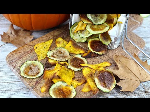 CĂłmo hacer chips de calabacĂn y calabaza crujientes. Chips de verduras al horno sin aceite, receta saludable de snacks y aperitivos con calabacĂn y calabaza especiados con pimienta, ajo y sal.