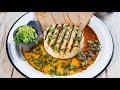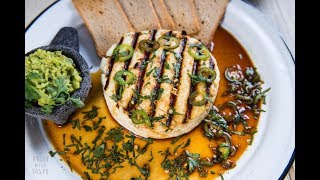 Sirve con galletas, tostadas, totopos, tortillas y con un guacamole al lado.