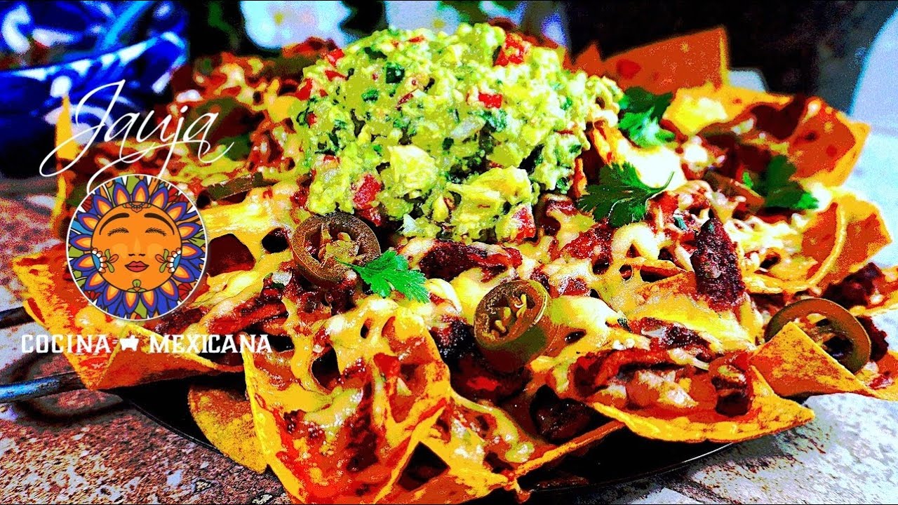 Nachos con Carne al Pastor. Nachos de Jauja Cocina Mexicana. Totopos de maíz con carne al pastor jugosa y suavecita, frijoles refritos, queso derretido, guacamole, pico de gallo y salsa de chiles morita y árbol. Receta de Nachos, ingredientes, y técnicas paso-a-paso de cómo hacer Nachos a la perfección. Un favorito de Jauja Cocina Mexicana para botanear con la familia en los juegos de futbol. Buen provecho.