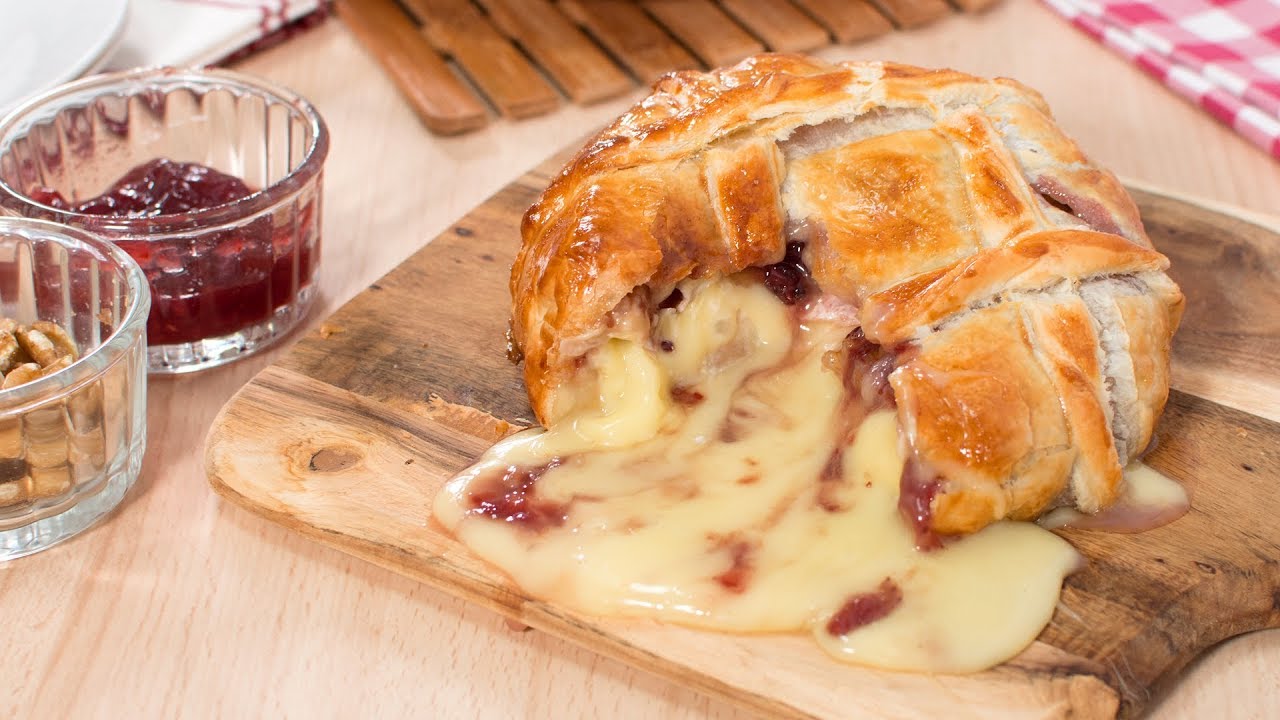 Vídeo de cómo hacer una Bomba de Hojaldre rellena de queso Camembert con mermelada de frutos del bosque y nueces.