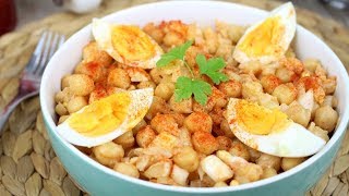Receta de ensalada de garbanzos con bacalao, huevo, cebolla y pimentĂłn. Receta de aprovechamiento de Semana Santa.