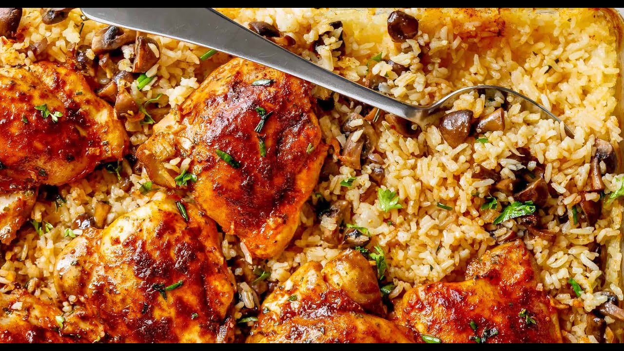 Easy Oven Baked Chicken And Rice With Garlic Butter Mushrooms mixed through is winner of a chicken dinner! FULL RECIPE: https://cafedelites.com/easy-oven-bak...