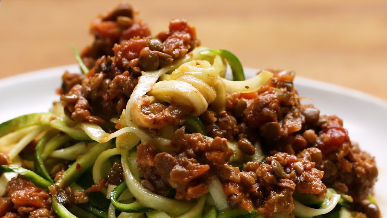 Make your summer meatless and light with spiraled veggie noodles topped with this delicious lentil bolognese.