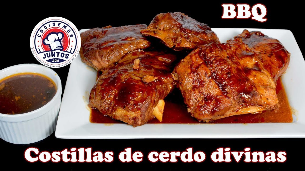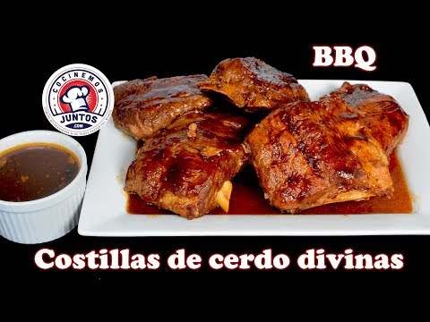 unas deliciosa y divinas costillas de cerdo o de puerco cocinadas en una olla olla de cocción lenta con salsa bbq aquí en cocinemosjuntos.. Se usan dos ristras de costillas baby back ribs y se marinan con sal, ajo en polvo, cilantro y tambien comino. siempre puedes condimentarlas a tu estilo. se fríen en una olla de hierro fundido para que agarren un buen sabor y color y despues de ponen en la olla de cocción por seis u ocho horas
