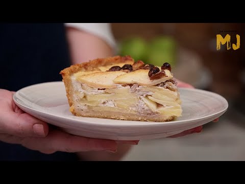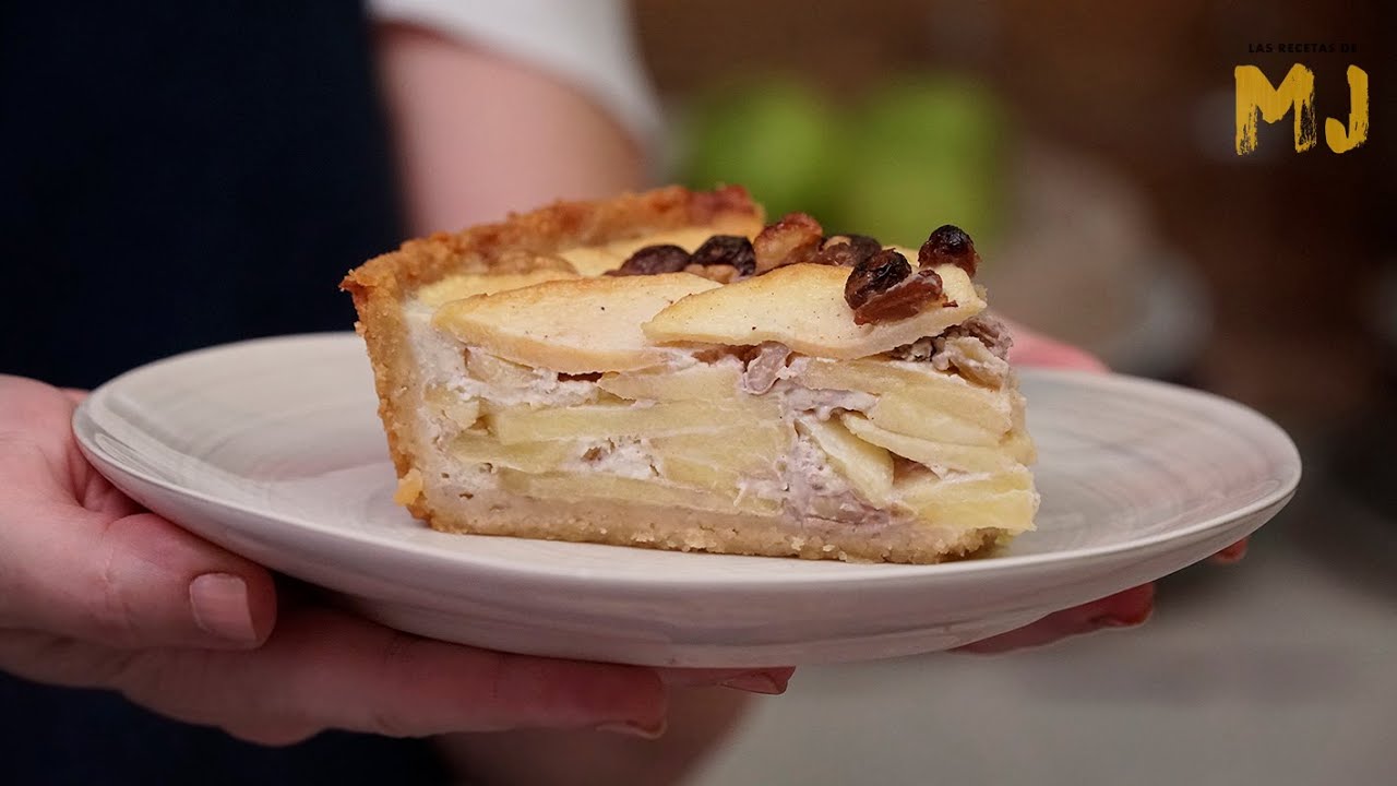 Esta tarta de manzana, nueces y pasas es típica de Alemania. Es muy fácil de hacer aunque tiene sus procesos. Para aligerar los tiempos podéis optar por usar masa quebrada comprada, aunque en el vídeo la haremos casera. Lo más difícil y laborioso del relleno es pelar y cortar las manzanas, el resto es coser y cantar.