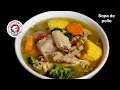 Una deliciosa sopa de pollo con muchas verduras. Esta sopa lleva, patas de pollo, alitas, muslo de pollo con huesos y piernas. se le agrega cilantro, cebollas, chiltomas, papas, elotes amarillos, zanahorias, calabacines italianos y mexicanos y sal. también ajo y jengibre. Una sopa o sancocho de pollo para el invierno.