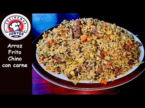 Arroz frito chino con carne aquí en cocinemosjuntos. Una deliciosa y fácil receta de comida china. Se necesita una libra y media de lomo de res o un buen tipo de carne suave. También se puede hacer con pollo. Se necesita arroz blanco ya cocinado. Ajo, apio, zanahorias, cilantro o culantro, nueve huevos. Salsa de soya, inglesa y de ostra. Eso es todo. Mira el video completo para que aprendas a cocinar una delicioso arroz frito con verduras. En mi canal de youtube, tengo muchas recetas chinas las cuales te invito a que las mires.
