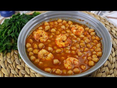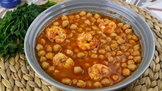 Receta de garbanzos con langostinos o garbanzos con gambones. Un guiso para Semana Santa muy nutritivo y delicioso.